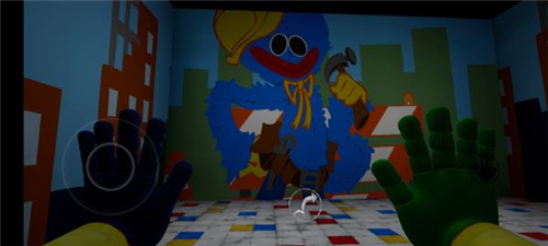 3、醒来后出现在一个陌生的世界,这里有很多玩具,左下角按钮可以操纵角色自由移动,右侧代表左右手掌,便于拾取物品,目前只能使用绿色手掌。
