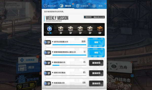 1、 日常任务:每天完成每日任务可获100免费货币,完成每周任务能额外获300免费货币及抽卡道具。