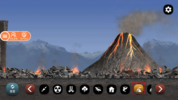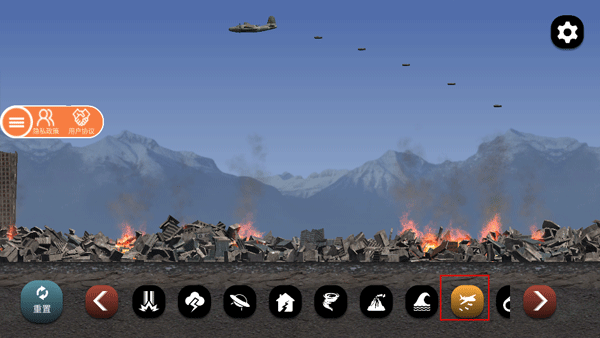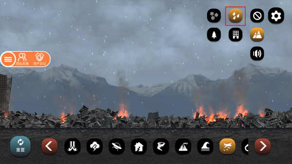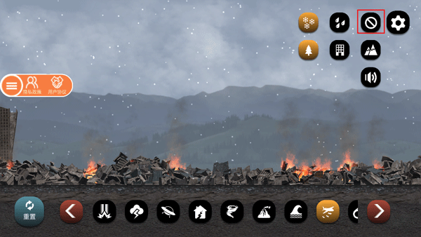 7、当城市被摧毁的不成样子时,你还可以下点雨或雪将将温,如果想要关掉天气,直接点击右边带有斜杠的图标即可。