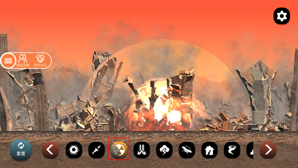 4、而中间多个功能按键则是破坏城市的各种方式,如下面类似雷达的图标,点击这个按钮,再点击城市,就会有一个陨石坠落到这座城市,将城市所有的建筑都摧毁掉。