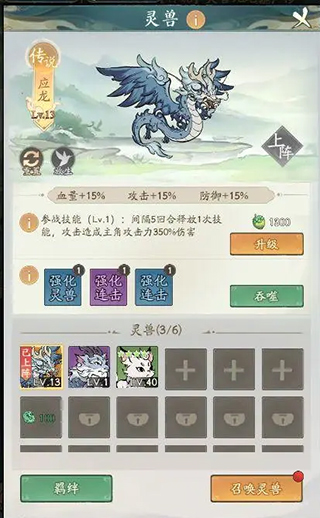 灵兽可以协助角色战斗,在战斗中释放参战技能,消耗灵兽果可以提升灵兽等级,灵兽升级后提高属性和技能伤害;(灵兽吞噬:当重复获得灵兽时,可以通过吞噬提高灵兽属性和被动技能,吞噬高星级灵兽会额外提升其对应的星级)