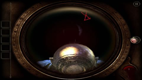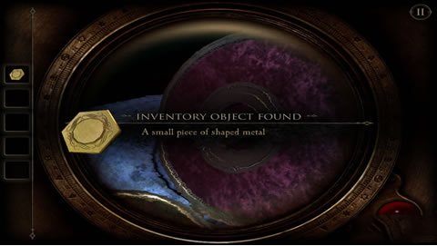 把我们刚弄到的完整的眼镜带上,对着这个圆盒子盖看上去,我们会发现有一个红色的指纹,这是我们点击指纹处。把手按倒红色指纹上去,这时我们会发现中间的小圆块会打开,我们会得到一个六边形铜片。