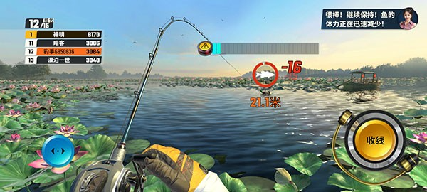 5、当鱼儿上钩后,玩家就可以收线了,当鱼没有力气后就成功钓上来了。