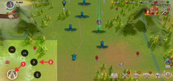 为此,您必须按住按钮一秒钟,然后会弹出4个功能。从上到下,前两个将直接跳到世界地图上最高级别的缩放。然后您可以使用左侧的选项仅查看特定元素,例如道路、联盟资源、标记等。