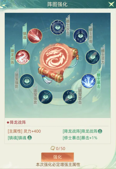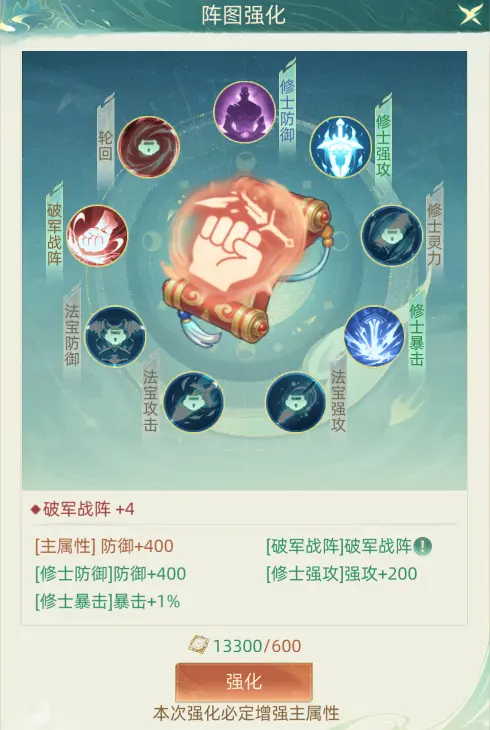 普通技能:最高强化4次,每次提升200点或1%暴击属性