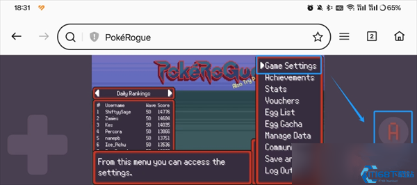 4、选择菜单中的“game settings”游戏设置,点击“A键”确认进入游戏设置;