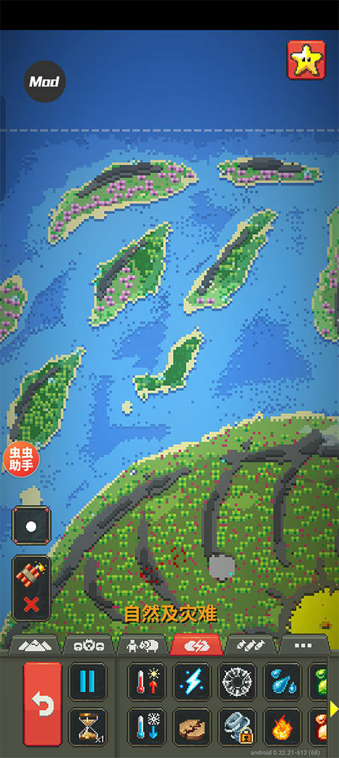 4、自然及灾害:玩家可操控的自然方面有播撒森林、沼泽、冰原等地貌的能力,创造不同的地貌,播撒丰富的资源矿物也会让生物的发展提供有利条件。灾害的可玩性也很高,操控大自然的力量对环境造成影响,除开常见的温度变化,还有影响剧烈的地震、闪电、飓风、火灾等大型灾害,它们都会对地貌造成毁灭性影响,对于生物文明自然是一场巨大的天灾。