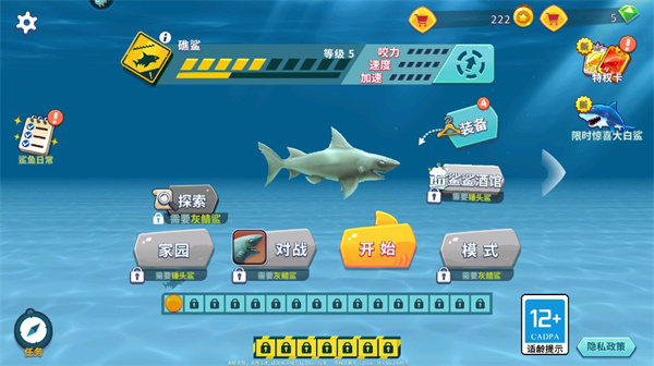 3、好玩的升级内容,可以通过升级强化提升鲨鱼的狩猎能力和生存能力: