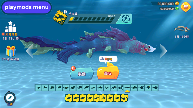 饥饿鲨进化(内置修改器),鲨鱼模拟冒险手游,游戏加入了数十种不同的鲨鱼,玩家可以解锁各种不同类型的鲨鱼进行冒险,滑动屏幕可以控制鲨鱼上下左右移动,去海底吞噬各种各样的生物,补充能量,如果生命降到零挑战结束。