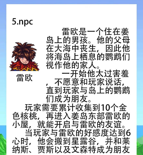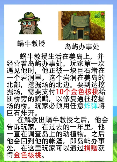 完成剧情并返回海滩后,堵住前往姜岛北部小路的海龟将会离开,并且会出现一团火焰引领你前往岛屿北部。你需要收集10个金色核桃,再进入姜岛东部雷欧的小屋,开启与雷欧的友谊。