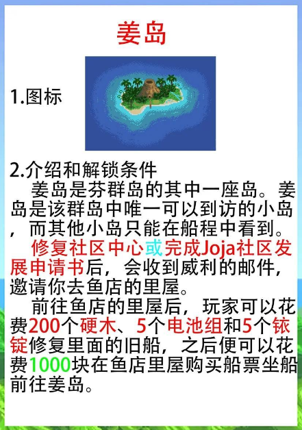 前往鱼店的里屋,你可以花费200个硬木、5个电池组和5个铱锭修复里面的旧船。修复完成后,你就可以花费1000块在鱼店里屋购买船票,坐船前往姜岛。