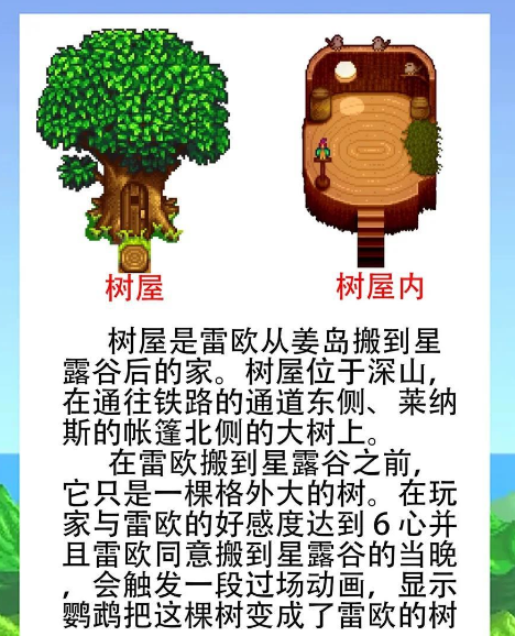 当玩家与雷欧的好感度达到6心时,他会搬到星露谷,并和莱纳斯、贾斯以及文森特成为朋友。他的树屋位于深山,在通往铁路的通道东侧、莱纳斯的帐篷北侧的大树上。