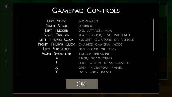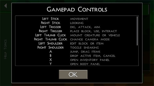 而 "gamepad controls" 选项则提供了操作教程,涵盖移动、采集、建造等关键操作的演示,新手玩家可通过反复练习熟悉按键布局。