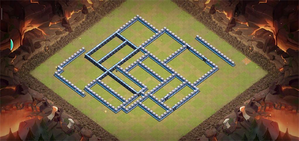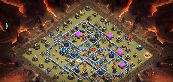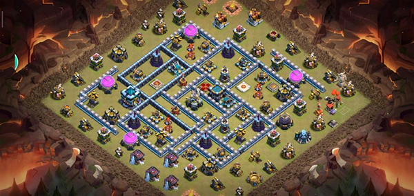 阵型解析:这是一个大本偏置的13本不规则格子阵,呈菱形的放置方法,大本与中心区域隔开放置。这种格局是一种比较常见的防守放置,对于陆军来说是需要弹跳或者地震才能穿透这个阵型的。火塔处均分散开,其中埋5电塔防止清边和引导部队走偏,也可以坑人。实测非常好用,适用于一般的部落战。