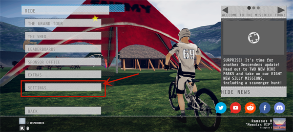 1、首先打开速降王者descenders手游后,进入游戏页面点击SETTINGS,如下图所示位置;