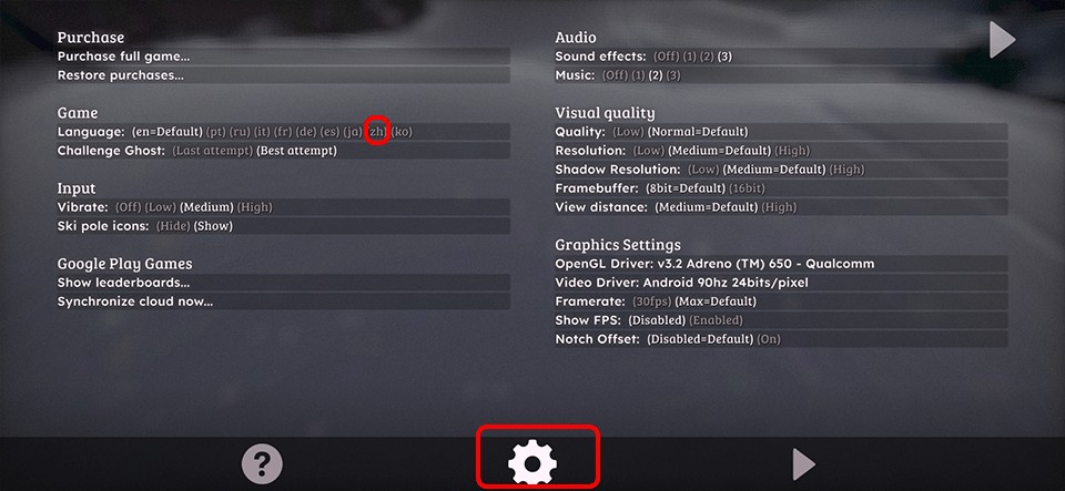 1、打开雪山滑雪大冒险2,游戏默认为英文,可在设置中找到language,点击en切换至zh即可调整语言为中文。