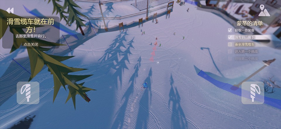2、设置好后,点击开始,玩家可通过点击两侧手掌图标操纵滑雪板加速前进;