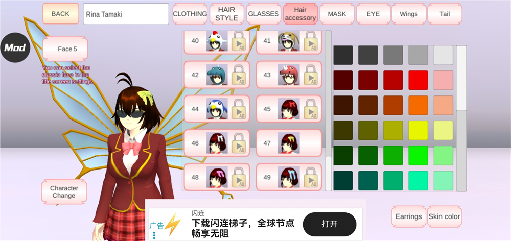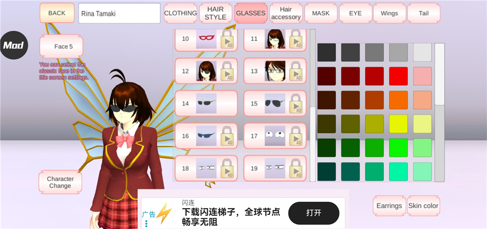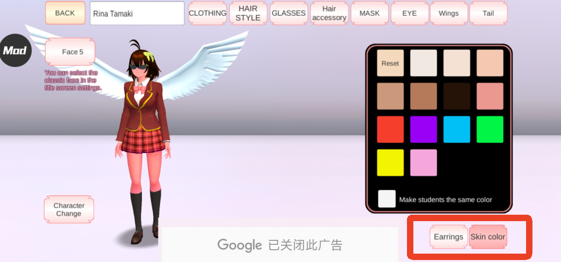 7、在右下角还有耳环和肤色的选择不要忘记了哦,肤色除了常见的几款,还有一些很有趣的颜色,比如绿色、黄色和蓝色等等。