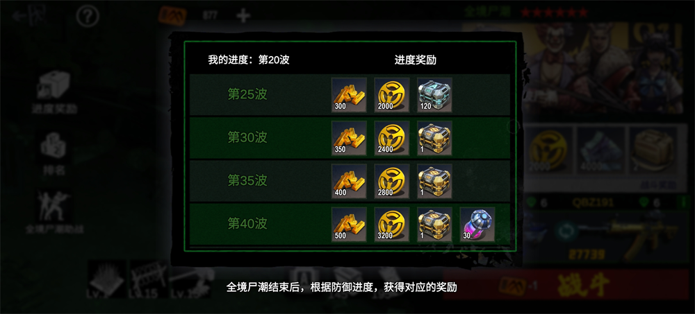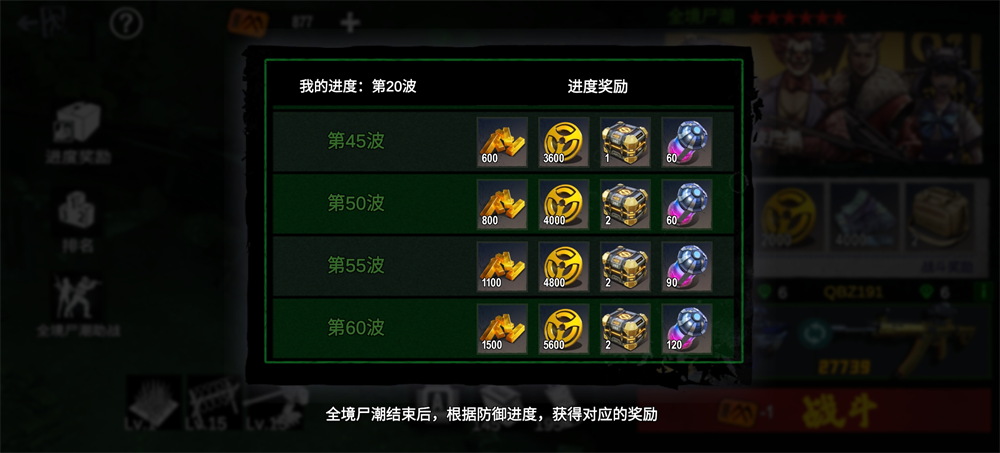 全境尸潮属动态难度活动体系,关卡强度与奖励梯度由策划团队逐期定制,兼顾挑战性与回馈感。奖励获取分为三大类:首要为**波次达标奖励**,依据你在本期活动中达成的最高通关波次,在活动结束后通过系统邮件统一分发对应档位实物奖励(非逐波发放)。例如成功突破至60波但在65波阵亡,则领取60波专属奖励;未达最低门槛波次则无对应奖励。