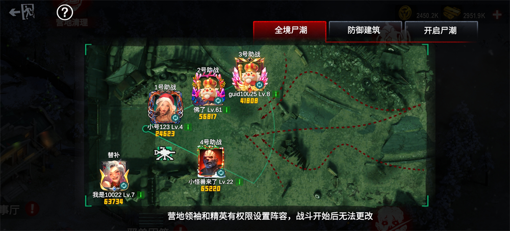 战斗采用“1主+4助”协同架构:玩家自身作为核心操作单位全程可控;其余4位助战成员由营地管理者于赛前锁定,身份固定且全程可用,无次数限制。若你被设为某位助战位(如2号位),当其他成员发起挑战时,该位置将自动启用替补角色替代出战。所有助战角色的数据、武器装配、技能配置均与营地常规尸潮系统完全同步,包括防御工事部署、陷阱触发逻辑及资源调用权限。