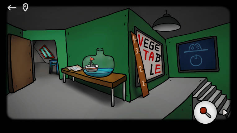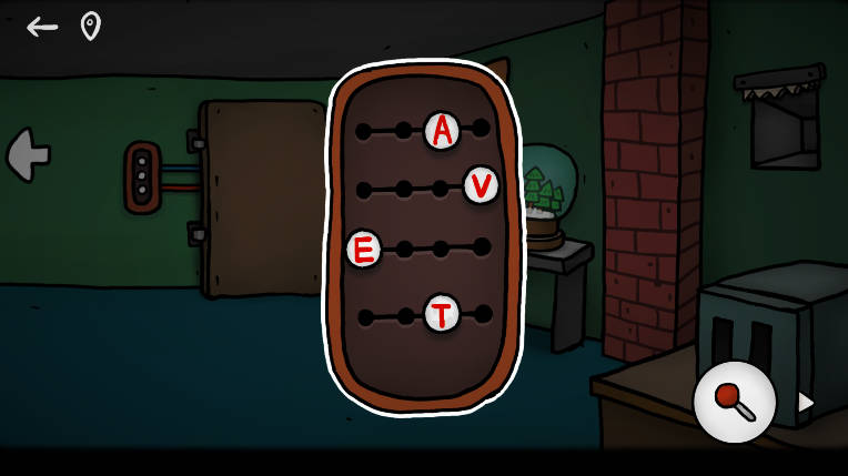 4、携两根操作杆登上二楼,留意墙面上四枚凸起字母【EATV】的排列顺序(含方向性),随后在窗边矮桌下方取得一把复古小铲