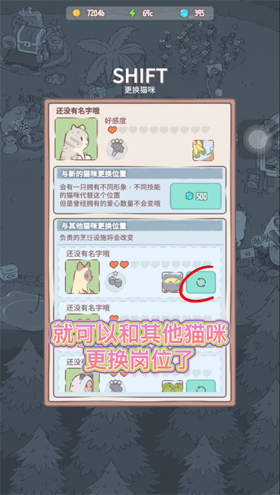 3、框选当前猫咪,再点击另一只猫头像,即可完成岗位互换——适合让怕生猫转岗休憩区,活泼猫接管采购任务;