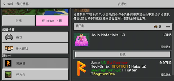 2、然后在我的世界创建游戏中,点击资源包,选择jojo开头的,点击激活