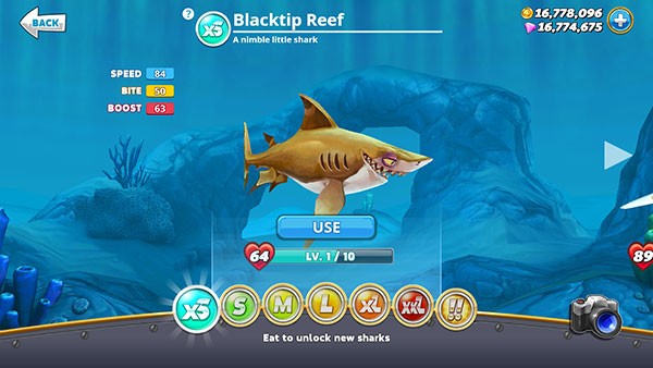 2、鲨鱼种类丰富且分等级解锁,收集金币才能获得更强大的海洋霸主,体验不同鲨鱼的独特能力。