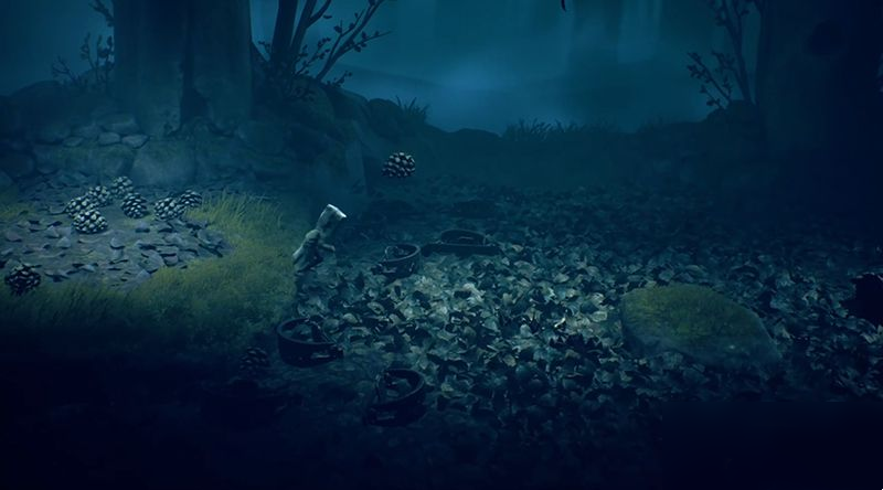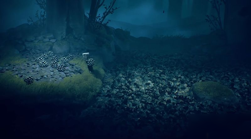 接着扔松果,触发地上的枯叶中的陷阱。