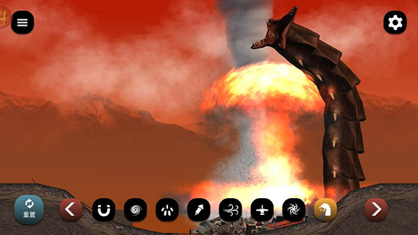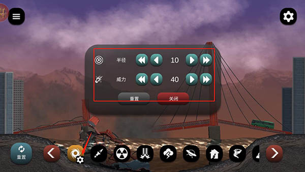 4、点击灾害图标旁齿轮按钮,可滑动调节作用半径、能量衰减曲线、持续时长三重参数;