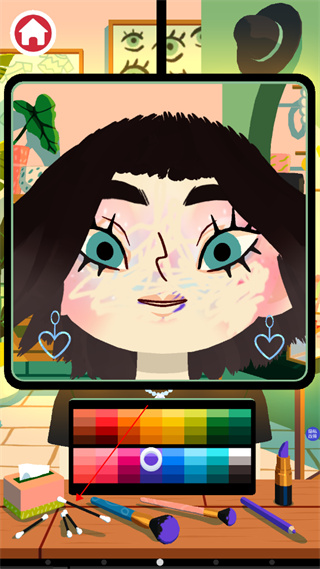 基础操作简洁直观,但真正的魅力藏在细节把控里。你可以为不同特征的角色定制方案——有胡须的顾客也能享受修容服务,长发短发皆可重塑轮廓。当头发随动作自然浮动时,善用“定型梳”工具能瞬间固定发丝,便于精准修剪;若不慎剪出缺口,点击红色生发剂瓶即可快速补救,让造型过程从容无压力。人物还会做出俏皮反应:眨眼、吐舌、打哈欠……让互动充满温度。化妆只需轻触工作台上的彩妆面板,展开眼影盘、腮红刷、唇釉等工具,即可开启微表情艺术创作。