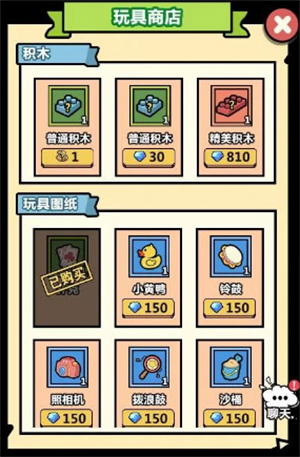 小伙伴们在游戏主界面的左下角可以看到玩具选项,点击玩具按钮进入到玩具商店进行购买就可以了,大家可以选择使用积木袋兑换普通积木也可以通过钻石购买普通积木和精美积木。