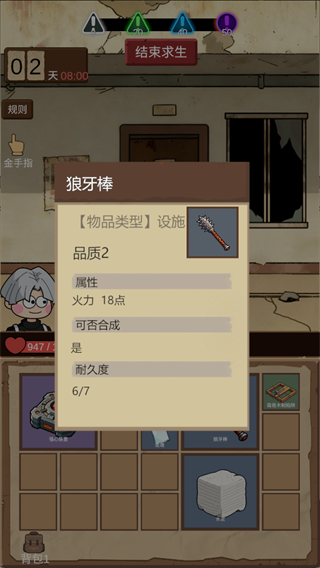 两件相同品质的物资道具可以进行合成,材料类型物品没有战斗能力,但是耐久无限;设施类型物品,拥有战斗能力,具备有限的耐久值,每过一天将会消耗1点耐久值;合成时有概率失败,成功则获得1件随机更高品质道具,具体合成概率请查看游戏内说明。