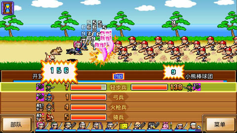 棒球队是比较多玩家感到难打的,因为我们统一天下的过程中一直使用火枪兵,而棒球队是无视火枪攻击的,所以会令很多玩家感到困难。事实上只要将火枪的连射改成弓兵,加强骑兵的攻击力,也依然很容易可以通过。