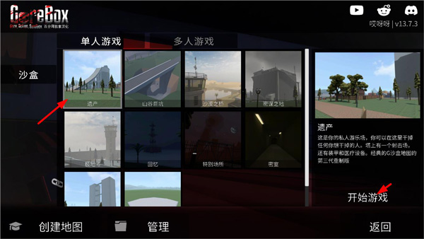 2、选择单人模式,浏览预设场景或使用自定义地图功能;选定“遗产地图”后点击“开始游戏”,载入世界;