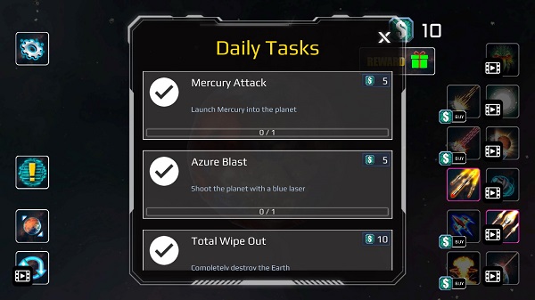 1、点击右侧工具栏切换武器类型与作用模式,选定目标区域后轻触星球即可启动投放流程。