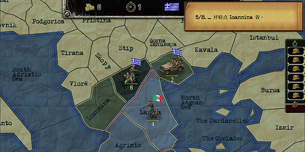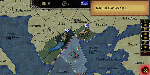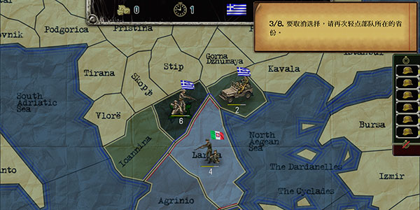 6、点击相邻的Ioannina省——因属己方控制区,界面将自动激活“战略转移”指令图标,区别于敌占区的“进攻”或中立区的“渗透”模式。