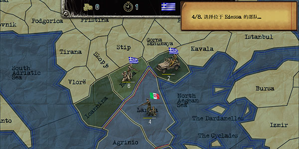 9、部队成功进驻Ioannina后,地图将实时更新其防御态势与后勤连接线;如需中止行动,返回Edessa点击“撤回未执行命令”即可。
