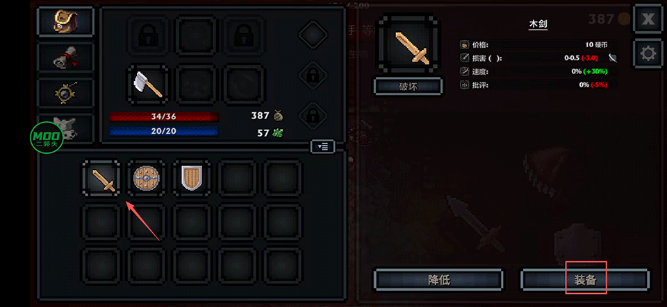 5、点击左上角角色头像进入装备管理界面,长按某件装备可查看详细属性,确认后点击“装备”即时生效;