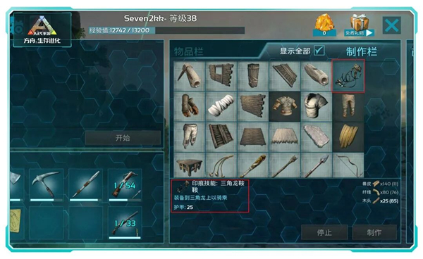 10、如果想要骑乘恐龙(部分恐龙不能骑乘),我们必须要找到自己宝宝所需要的马鞍,马鞍制作的学习需要使用技能点到技能栏里学习,不同的宝宝所需要的马鞍是不一样的,这就表示我们要达到一定的等级才能骑上不同的坐骑。