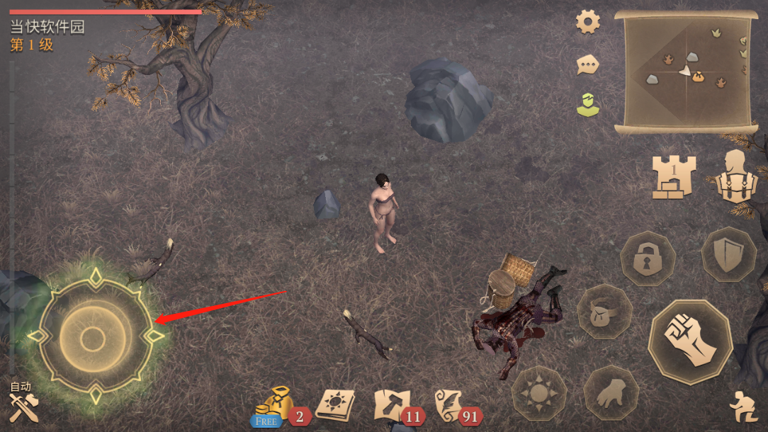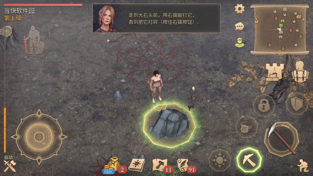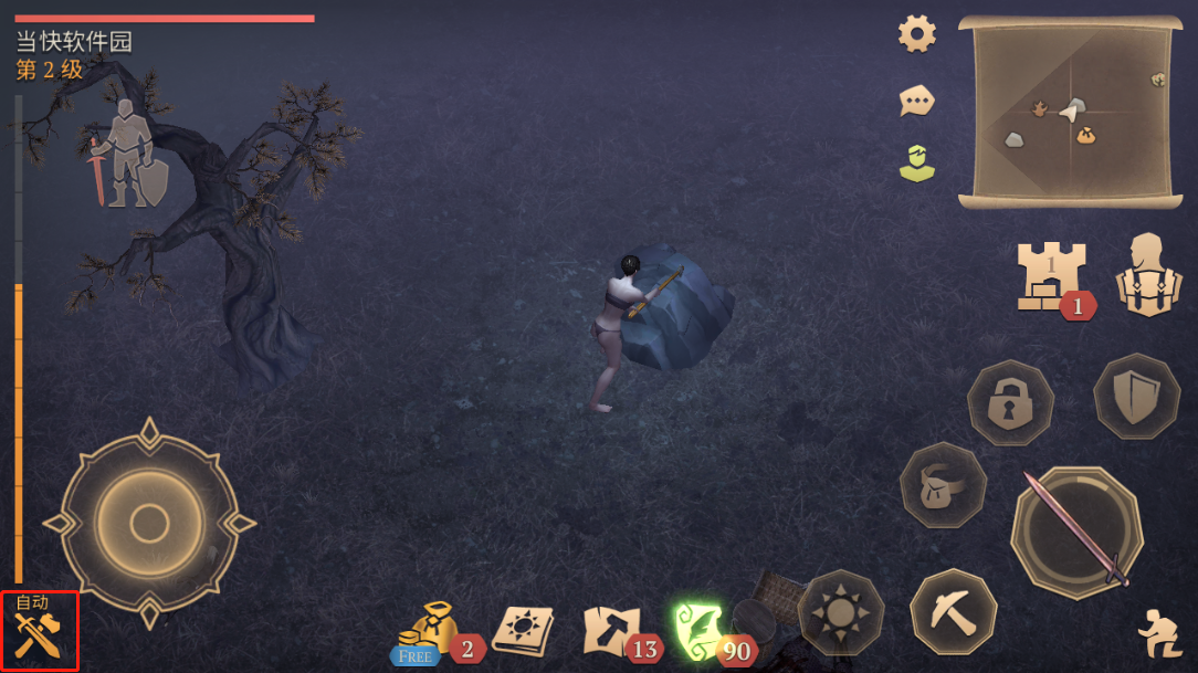 9、面对粗壮朽木,持续点击右下角斧图标执行连击,直至树干崩裂倾倒;