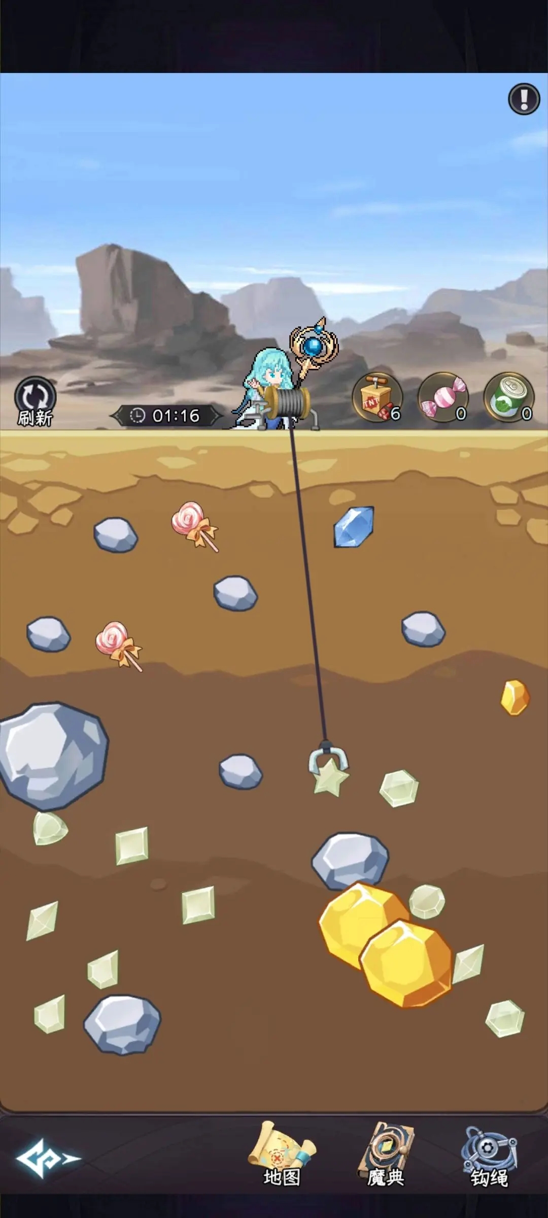 「泰坦钩索」是此玩法的核心生产力工具,其作用远超表面挖矿——集齐宝石套装后可激活「晶簇共鸣」特效,大幅提升全队暴击率与能量恢复速度。真正稀缺的是各色原生宝石,其他道具仅作过渡使用。体力恢复机制为每小时1点,空钩不扣体力;而糖果消耗60秒、炸弹则会摧毁已钩取目标并扣除对应体力。氪金玩家常用炸弹快速清理无效目标,大幅压缩单局耗时;效率值影响钩取动作持续时间,前期影响微弱,但后期挖掘紫晶需耗时超60分钟,此时高效率值将成为关键破局点。