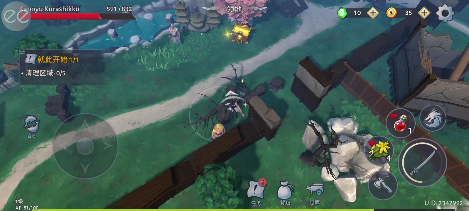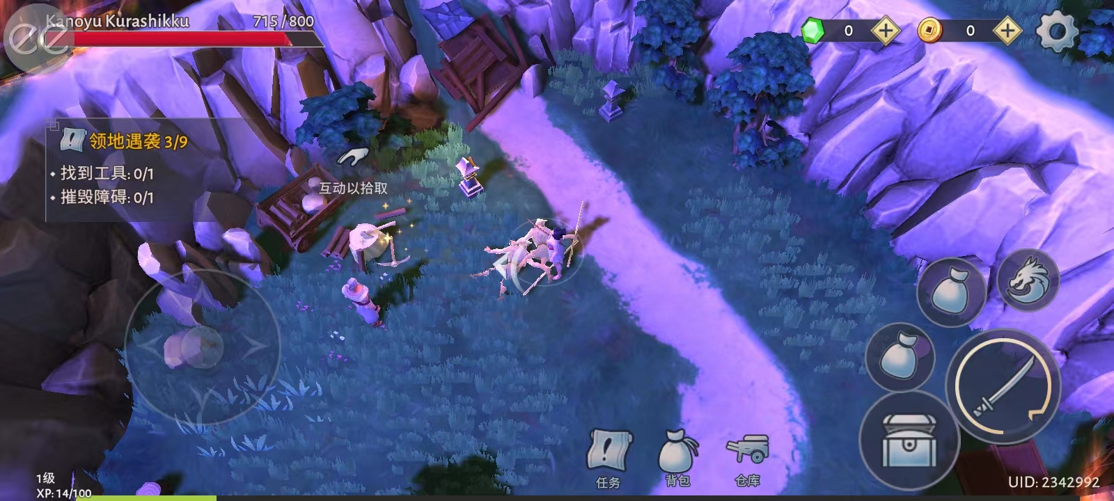 2、地面浮现金色指引箭头,提示当前目标方位;左侧虚拟摇杆控制移动方向,右侧技能/交互键配合触发动作,轻松完成“搜寻工具→清除路障”流程;