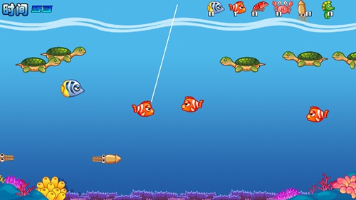 5、钓鱼方法很简单,我们只要点击屏幕,上方的鱼线就会向下延长,当鱼线顶端刚好碰到鱼,就能将它吊起来了。这个大家多尝试几次就可以轻松钓到鱼。