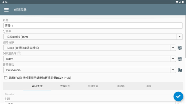 2、根据设备性能,合理设置容器分辨率与显存分配(低配机型建议选择720p及以下分辨率,并将显存控制在1GB以内)。