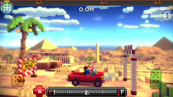 开局仅有一辆基础款红色皮卡可供使用,操作机制简洁却富有张力:屏幕左右下角分别为倒车与前进触控区;上方实时显示行驶里程,下方则为动态油量条。游戏引入真实感十足的“车体损伤系统”——剧烈撞击不仅削减生命值,还会伴随黑烟升腾、零件飞溅等视觉反馈,倒逼玩家放弃莽撞冲刺,转而练习微操走位与惯性控制。
