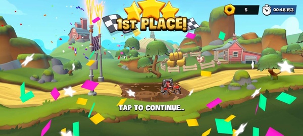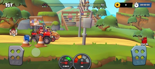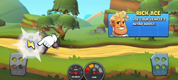 1.在游戏内,我们可以长按右边的油门来进行移动并加速,长按左侧来控制车辆重心旋转,上方的黄条是赛程完成度