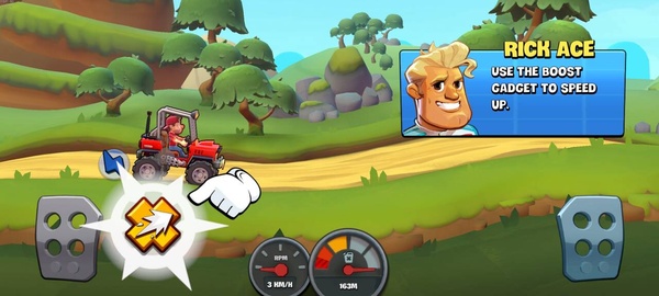 2.我们通过旋转和收集金币等操作来积攒能量条,能量条满了之后我们可以点击这个图标来使赛车加速