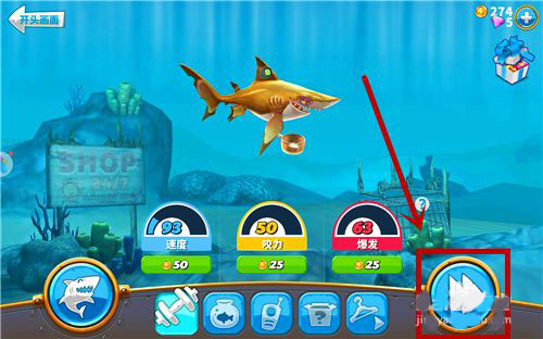 4、升级鲨鱼,相当于升级它的能力,升级需要里面的金币,金币可以通过吃吃吃获得。