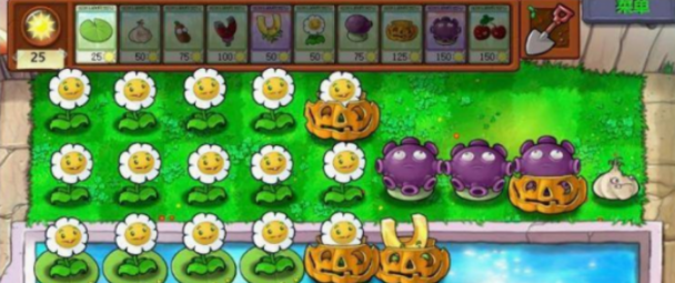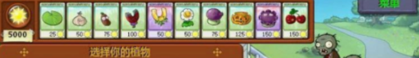 植物选择:向日葵、双子向日葵、樱桃炸弹、卷心菜投手、南瓜头、坚果墙、窝瓜、高坚果墙。